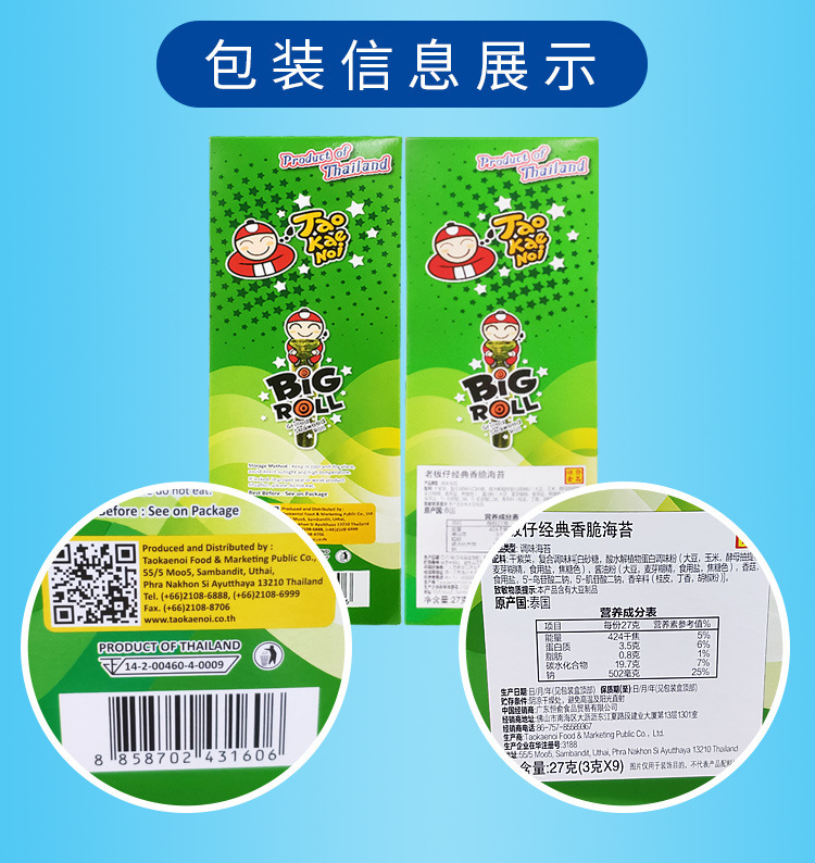 泰国进口老板仔海苔27g香脆紫菜原味脆海苔儿童脆海苔紫菜 现120